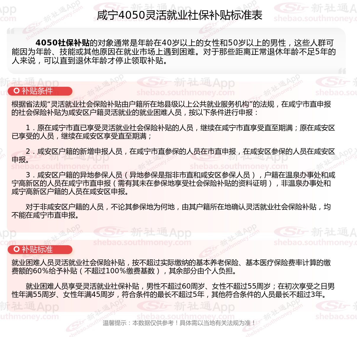 2025咸宁4050补贴主要针对的是年龄在40岁以上的女性和50岁以上的男性,这些人群通常因为年龄较大而面临就业困难。