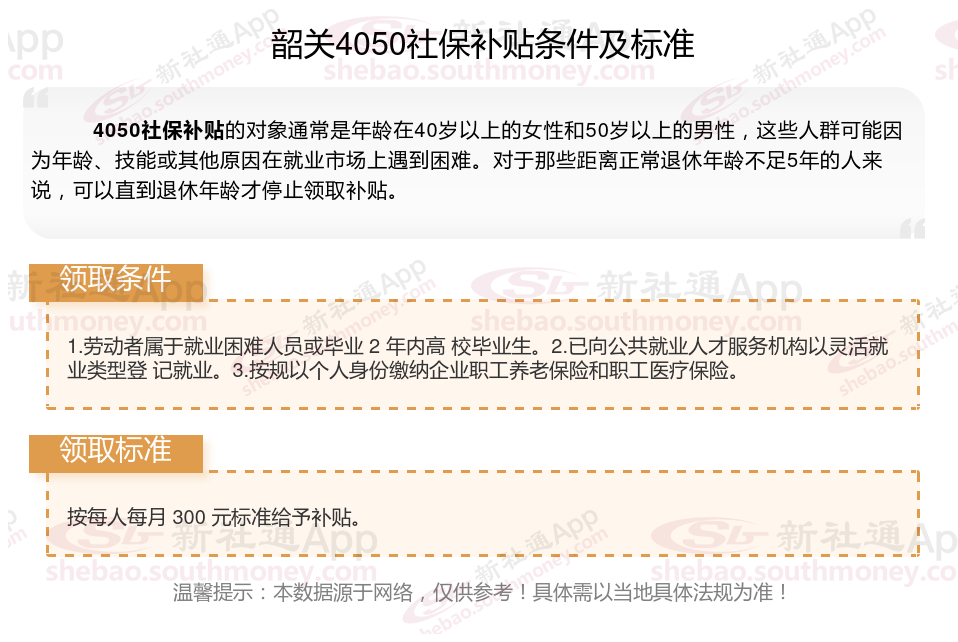 二、2025年韶关4050社保补贴标准及条件,最新如下:
