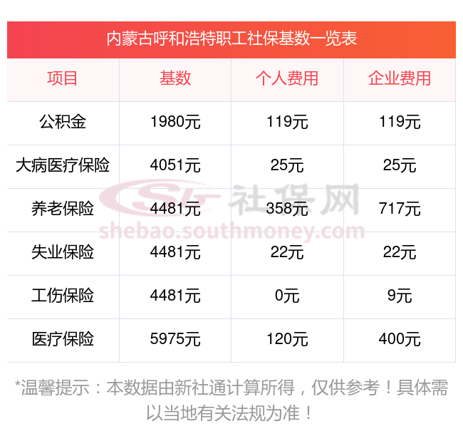 内蒙古呼和浩特公司和个人社保缴纳比例一般情况为养老保险单位缴20%个人缴8%;医疗保险单位缴6%个人缴2%;工伤保险由用人单位缴纳,工伤保险费率分为0.6%—3.6%;生育保险由用人单位缴纳,费率为0.3%;失业保险:单位缴0.6%个人缴0.4%。那么2024内蒙古呼和浩特职工社保缴费多少钱一个月,2024内蒙古呼和浩特职工社保缴纳明细是多少?接下来随社保网小编一起了解最新资讯。