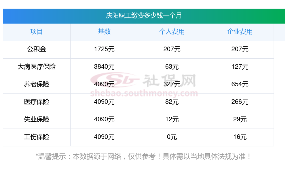 庆阳公司和个人社保缴纳比例一般情况为养老保险单位缴20%个人缴8%;医疗保险单位缴6%个人缴2%;工伤保险由用人单位缴纳,工伤保险费率分为0.6%—3.6%;生育保险由用人单位缴纳,费率为0.3%;失业保险:单位缴0.6%个人缴0.4%。那么2024庆阳职工社保缴费多少钱一个月,2024庆阳职工社保缴纳明细是多少?接下来随社保网小编一起了解最新资讯。