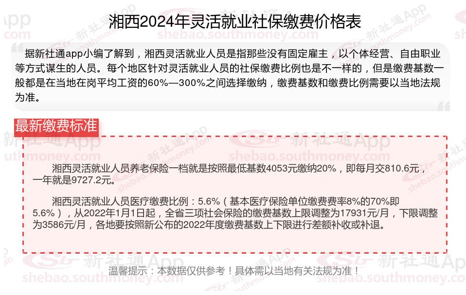 随着经济的发展和社会的进步,灵活就业人员越来越多,但是很多人不知道如何缴纳社保。本文将介绍2024年湘西灵活就业人员社保缴费基数及如何缴纳社保,能领取多少钱,帮助大家更好地了解灵活就业社保,随着新社通APP小编一起了解湘西灵活就业社保缴费最新资讯吧。