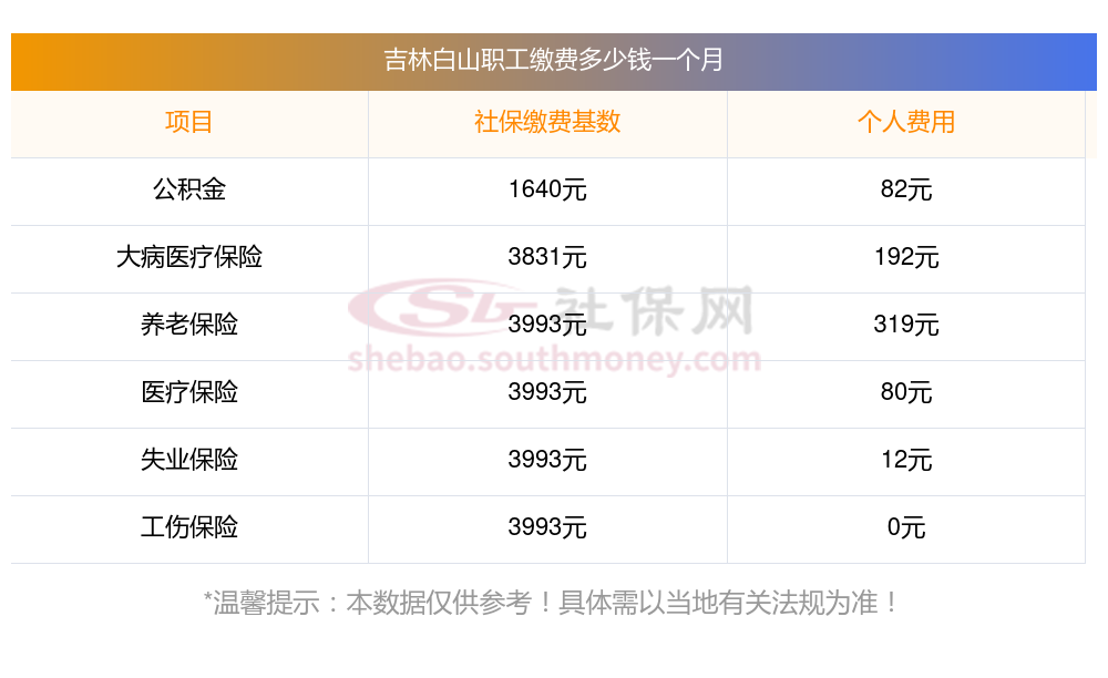 提示:吉林白山职工社保缴费最低基数暂停参照为3993.20,职工社保缴费包括了五种保险,包括养老保险、医疗保险、失业保险、工伤保险和生育保险;其中养老保险、医疗保险和失业保险,这三种险是由企业和个人共同缴纳的保费,工伤保险和生育保险完全是由企业承担的。个人不需要缴纳。