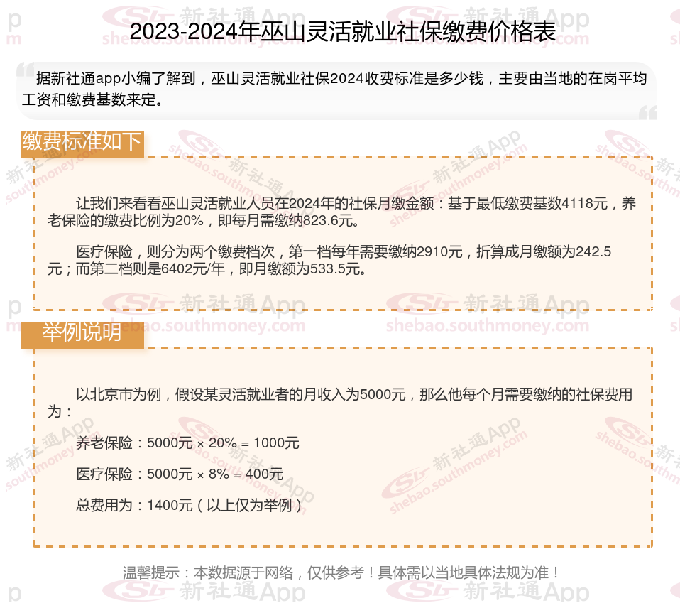 随着经济的发展和社会的进步,灵活就业人员越来越多,但是很多人不知道如何缴纳社保。本文将介绍2024年巫山灵活就业人员社保缴费基数及如何缴纳社保,能领取多少钱,帮助大家更好地了解灵活就业社保,随着新社通APP小编一起了解巫山灵活就业社保缴费最新资讯吧。