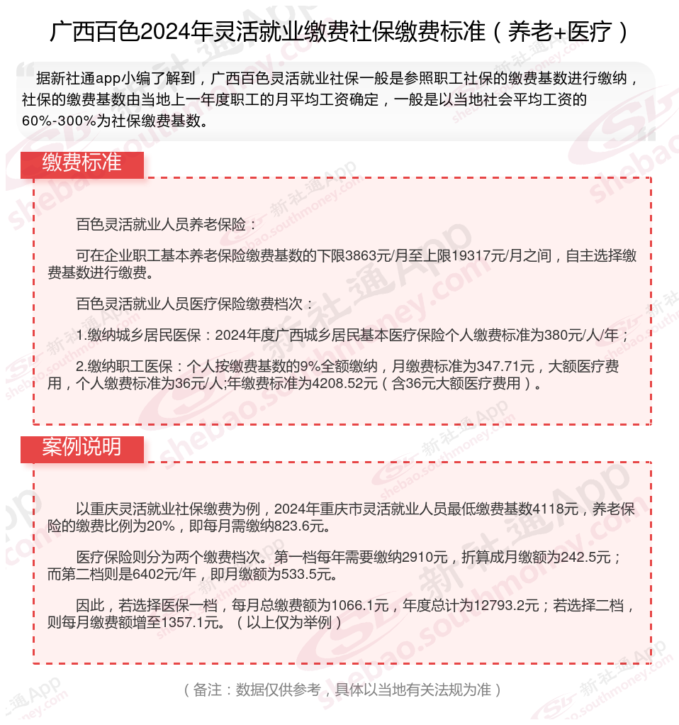 二、广西百色2024年灵活就业社保缴费基数、比例最新消息
