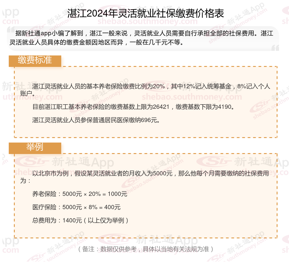湛江灵活就业社保2024收费标准是多少钱,主要由当地的在岗平均工资和缴费基数来定。其次,灵活就业社保缴纳跟职工缴纳不同的地方在于,灵活就业社保参保只能参保养老保险和医疗保险,且缴纳比例完全由个人承担。另外,灵活就业人员社保参保选择,可自由选择参保城镇职工社保和城乡居民保险。2024年湛江灵活就业社保缴多少钱?如何缴纳?怎么计算待遇?新社通APP小编将在下文为您详细说明。