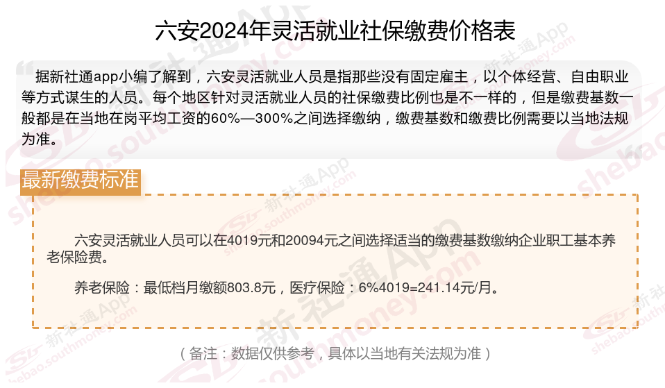 一、2024年六安灵活就业社保缴费标准表 六安灵活就业社保多少钱一个月?