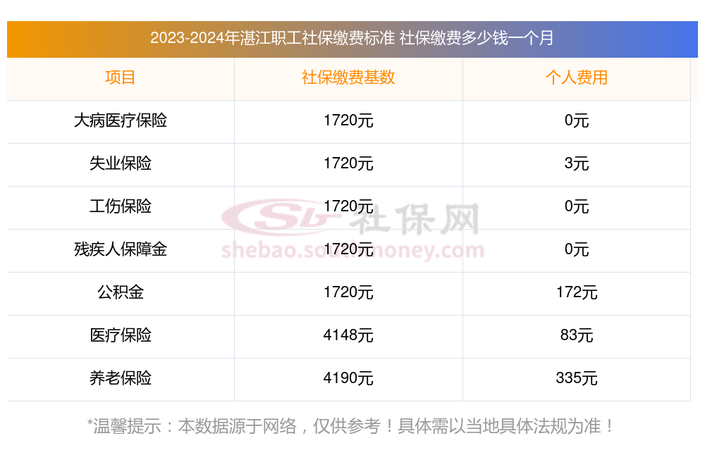 据新社通app显示,湛江社保缴费基数2023-2024年标准,(社保最低一个月要交多少钱)湛江社保费用如下: