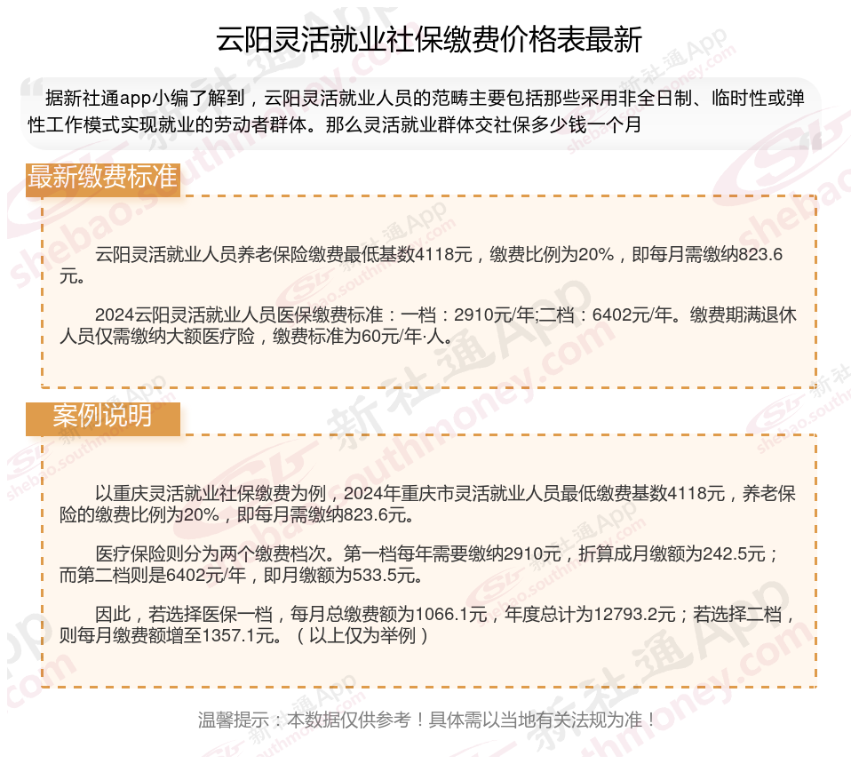 一、2024年云阳灵活就业社保缴费标准表 云阳灵活就业社保多少钱一个月?