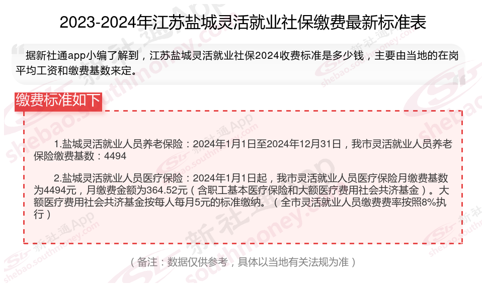 一、2024年江苏盐城灵活就业社保缴费标准表 江苏盐城灵活就业社保多少钱一个月?