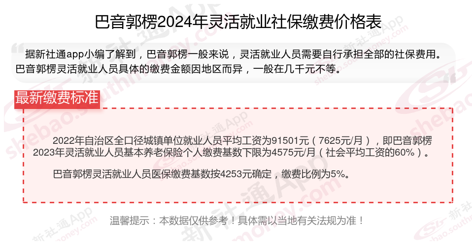 一、2024年巴音郭楞灵活就业社保缴费标准表 巴音郭楞灵活就业社保多少钱一个月?