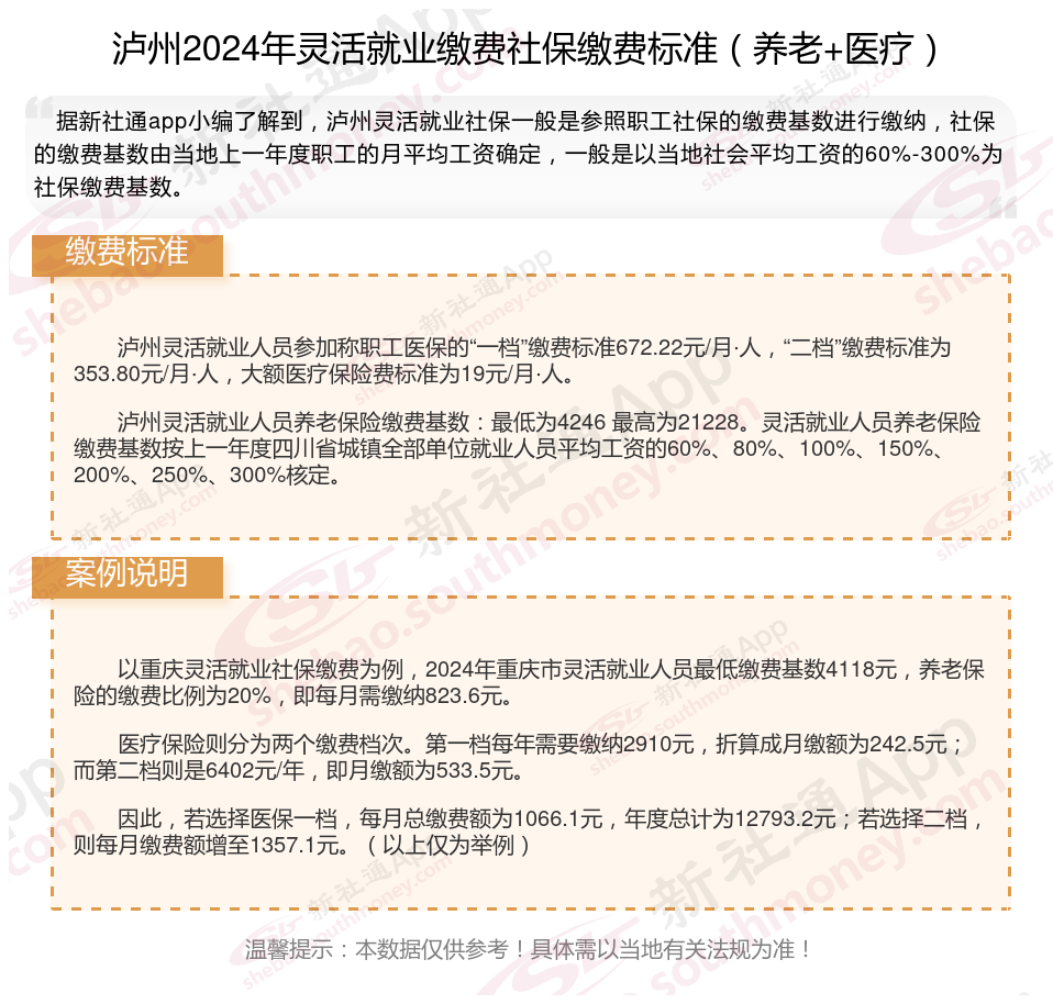 二、泸州2024年灵活就业社保缴费基数、比例最新消息
