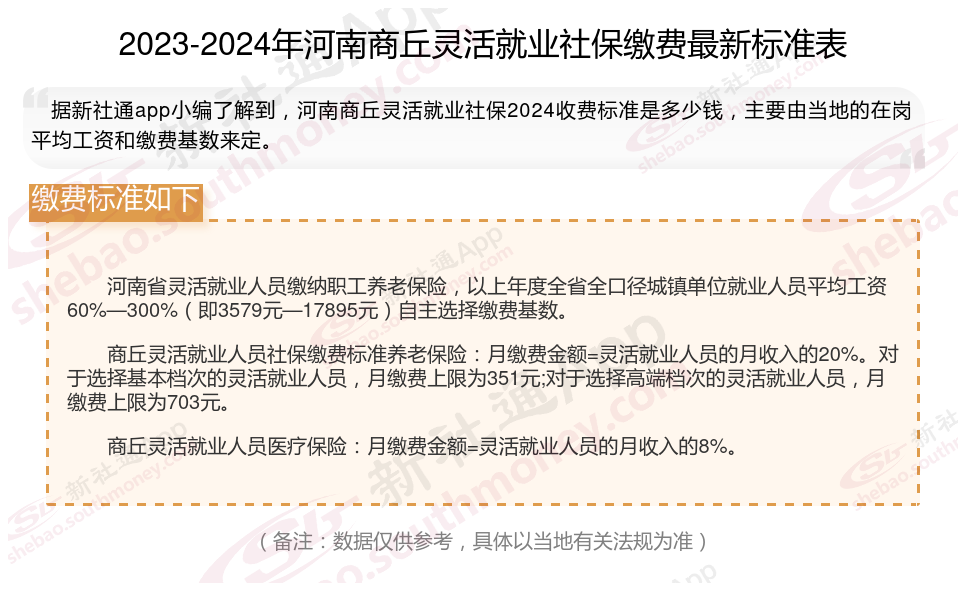 河南商丘灵活就业社保2024收费标准是多少钱,主要由当地的在岗平均工资和缴费基数来定。其次,灵活就业社保缴纳跟职工缴纳不同的地方在于,灵活就业社保参保只能参保养老保险和医疗保险,且缴纳比例完全由个人承担。另外,灵活就业人员社保参保选择,可自由选择参保城镇职工社保和城乡居民保险。2024年河南商丘灵活就业社保缴多少钱?如何缴纳?怎么计算待遇?新社通APP小编将在下文为您详细说明。