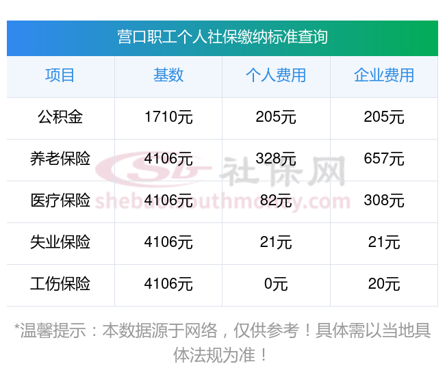 营口职工社保缴费多少钱?营口职工社保缴费基数最新参考为:3579.00,具体如下: