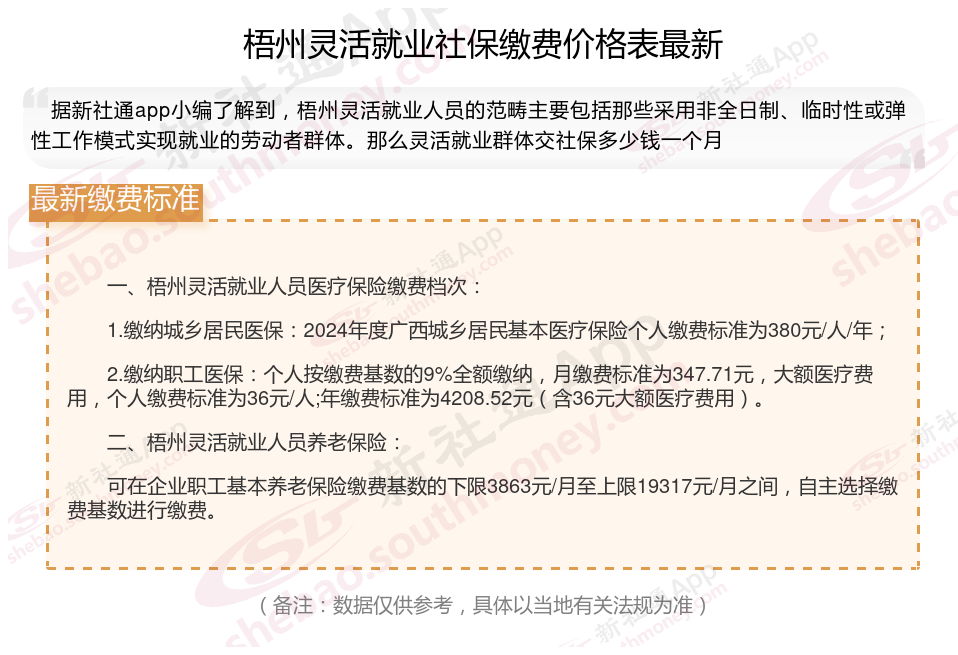 一、2024年梧州灵活就业社保缴费标准表 梧州灵活就业社保多少钱一个月?