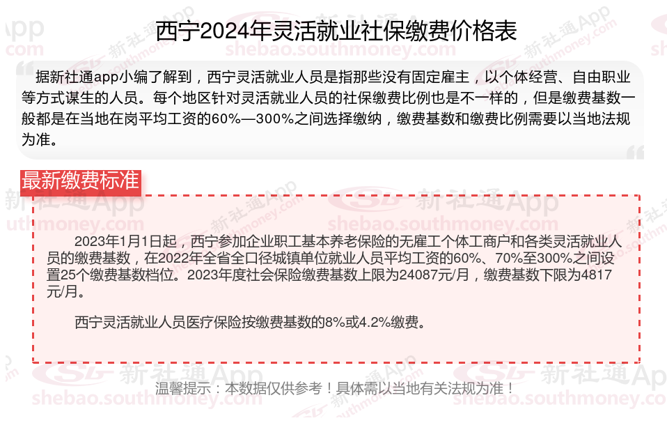 对于灵活就业者来说,社保缴纳是一个非常重要的问题。那么,2024年西宁灵活就业社保怎么交?一个月要交多少呢?领取待遇如何计算的?接下来随新社通APP小编一起了解西宁灵活就业社保缴费具体详情吧。