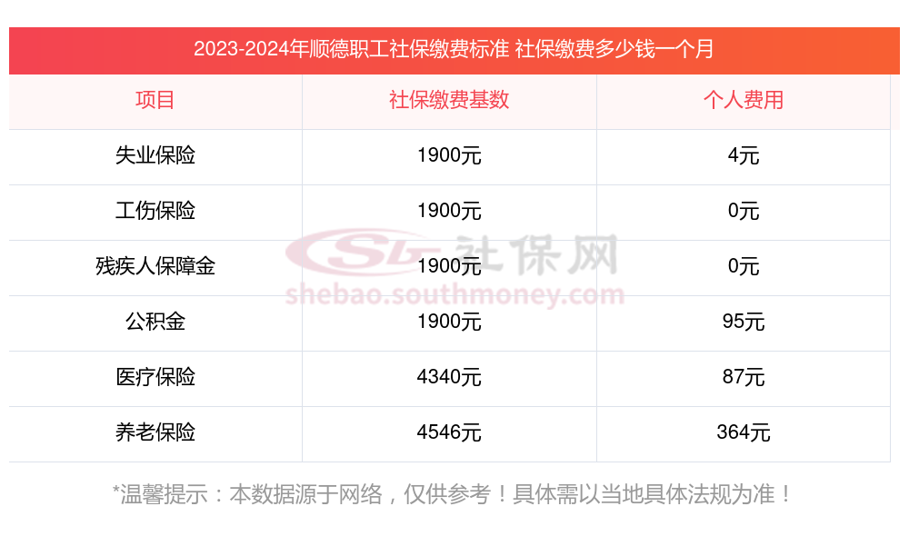据新社通app显示,顺德社保缴费基数2023-2024年标准,(社保最低一个月要交多少钱)顺德社保费用如下: