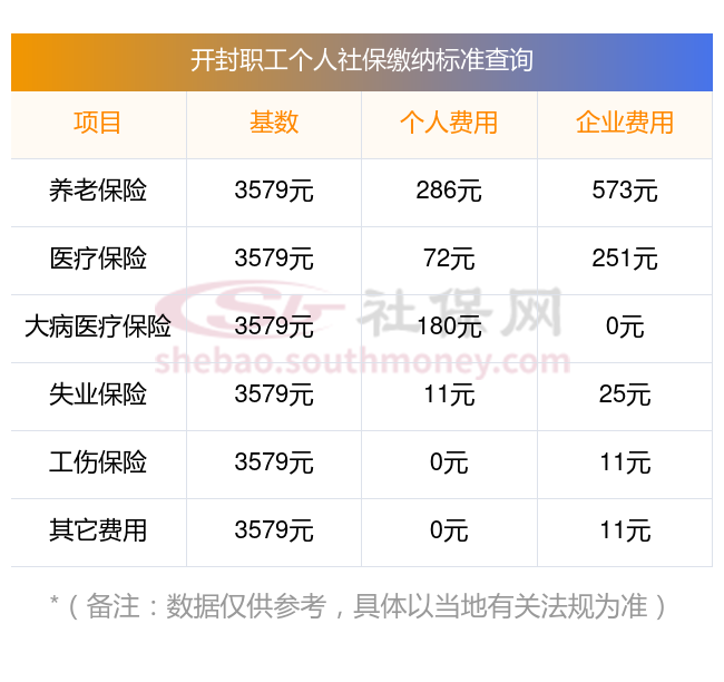 据新社通app显示,开封企业职工社保缴费基数为:3579.00元,那么开封社保费用是怎么样的?如下: