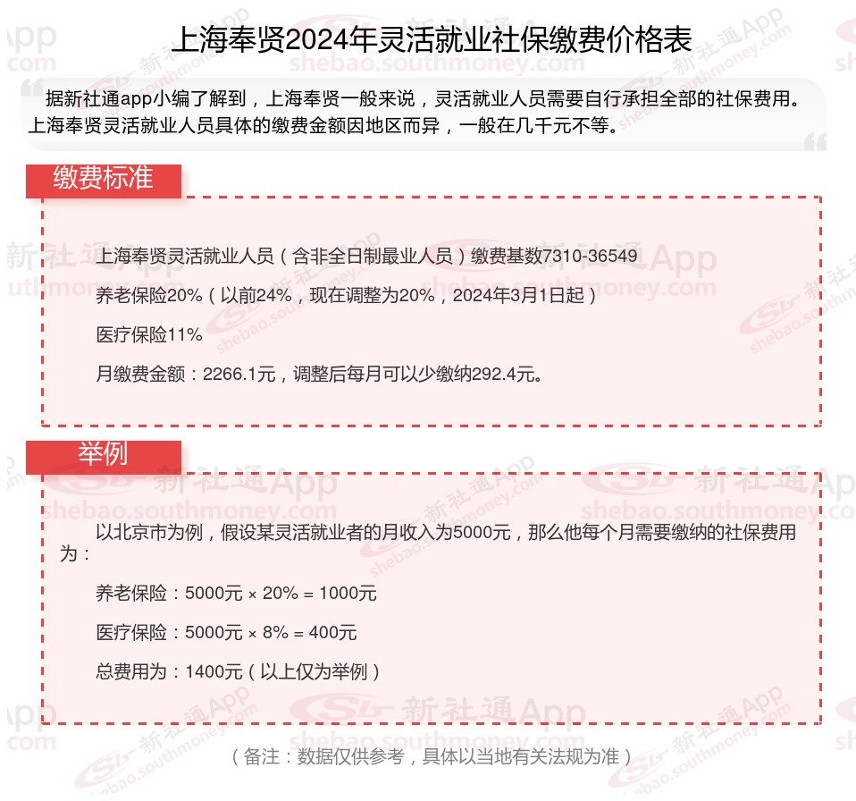 一、2024年上海奉贤灵活就业社保缴费标准表 上海奉贤灵活就业社保多少钱一个月?