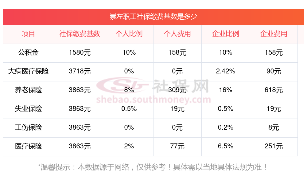 据新社通app小编了解,2023-2024年崇左社保缴费基数参照为3579.00,崇左社保最低一个月要交多少钱?如下: