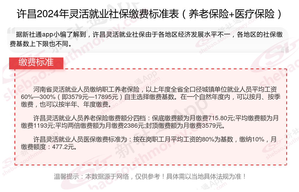 一、2024年许昌灵活就业社保缴费标准表 许昌灵活就业社保多少钱一个月?