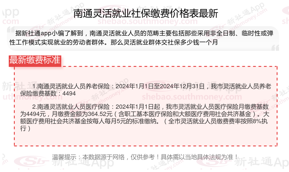 一、2024年南通灵活就业社保缴费标准表 南通灵活就业社保多少钱一个月?