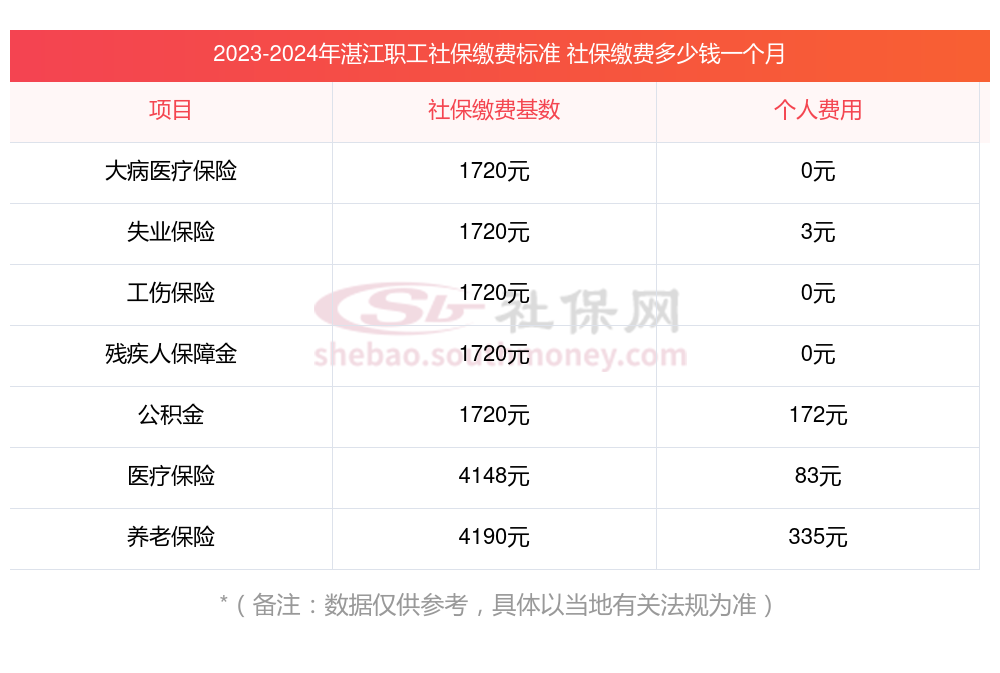 湛江职工社保缴费多少钱?湛江职工社保缴费基数最新参考为:3579.00,具体如下: