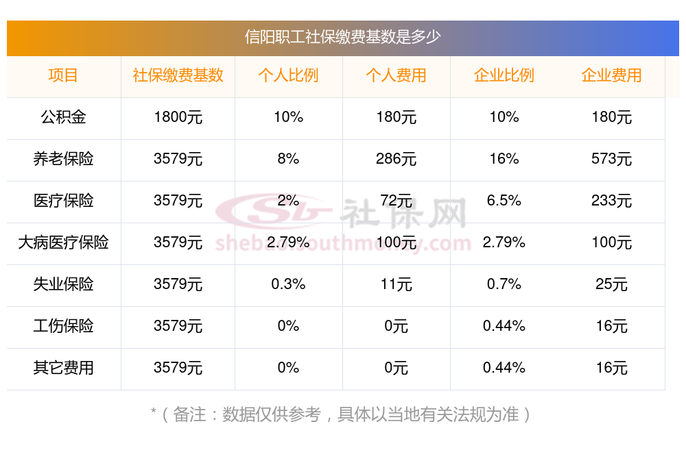 信阳职工社保缴费多少钱?信阳职工社保缴费基数最新参考为:3579.00,具体如下: