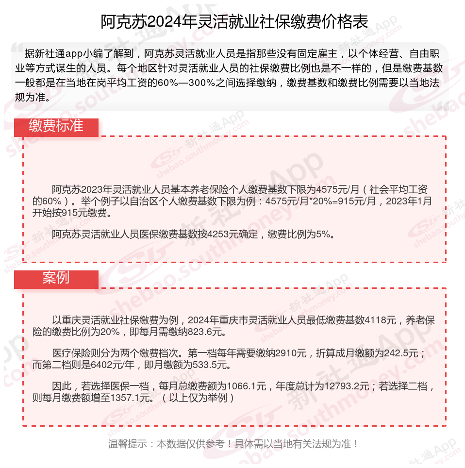 二、阿克苏2024年灵活就业社保缴费基数、比例最新消息
