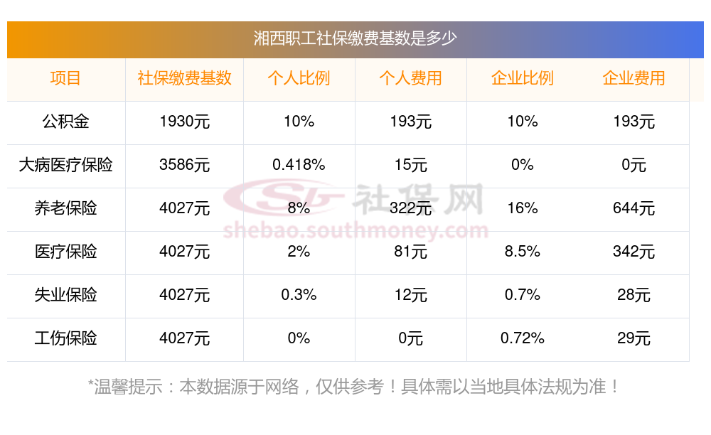 据新社通app显示,湘西社保缴费基数2023-2024年标准,(社保最低一个月要交多少钱)湘西社保费用如下:
