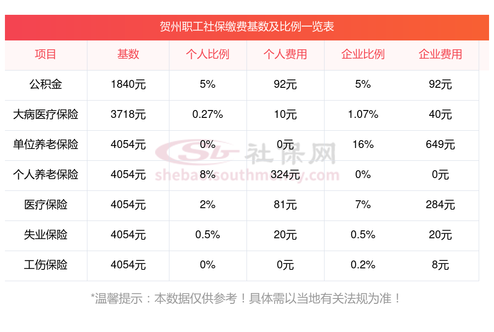 据新社通app显示,贺州社保缴费基数2023-2024年标准,(社保最低一个月要交多少钱)贺州社保费用如下: