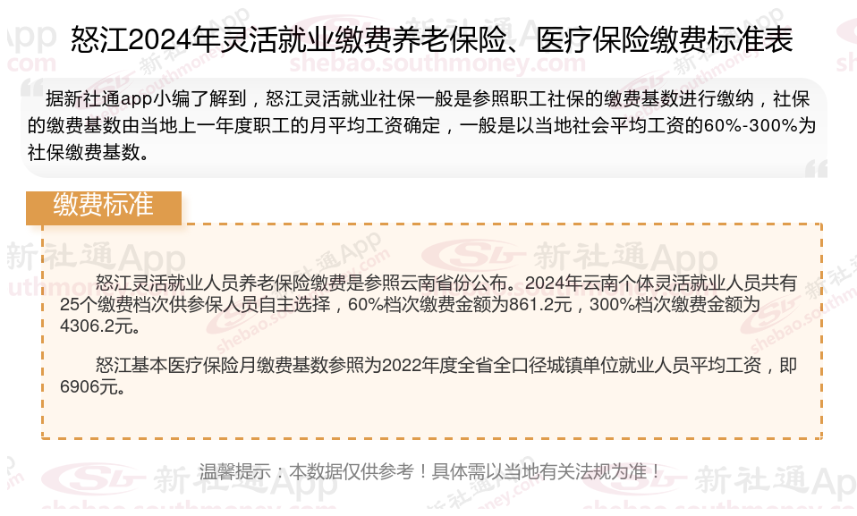 随着经济的发展和社会的进步,灵活就业人员越来越多,但是很多人不知道如何缴纳社保。本文将介绍2024年怒江灵活就业人员社保缴费基数及如何缴纳社保,能领取多少钱,帮助大家更好地了解灵活就业社保,随着新社通APP小编一起了解怒江灵活就业社保缴费最新资讯吧。