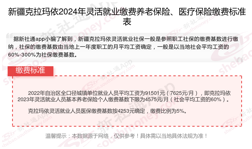 一、2024年新疆克拉玛依灵活就业社保缴费基数、比例最新消息