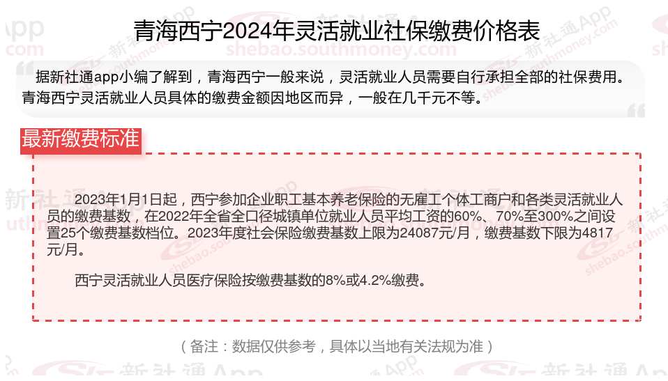 随着经济的发展和社会的进步,灵活就业人员越来越多,但是很多人不知道如何缴纳社保。本文将介绍2024年青海西宁灵活就业人员社保缴费基数及如何缴纳社保,能领取多少钱,帮助大家更好地了解灵活就业社保,随着新社通APP小编一起了解青海西宁灵活就业社保缴费最新资讯吧。