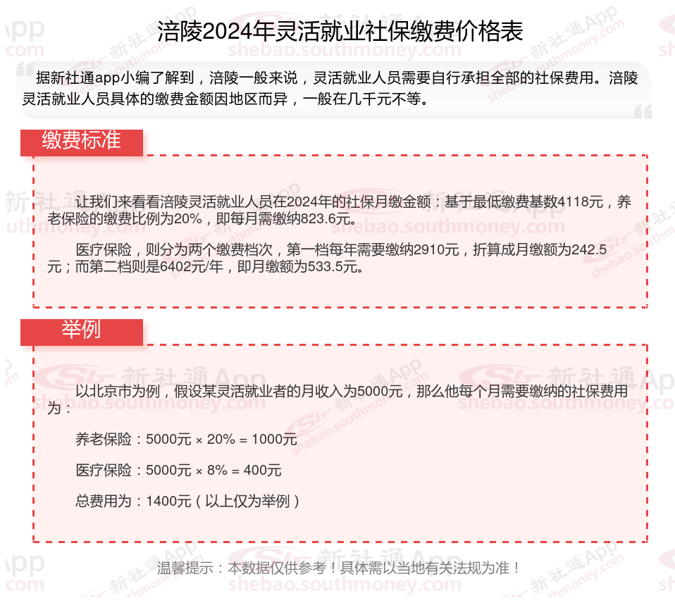 涪陵灵活就业社保2024收费标准是多少钱,主要由当地的在岗平均工资和缴费基数来定。其次,灵活就业社保缴纳跟职工缴纳不同的地方在于,灵活就业社保参保只能参保养老保险和医疗保险,且缴纳比例完全由个人承担。另外,灵活就业人员社保参保选择,可自由选择参保城镇职工社保和城乡居民保险。2024年涪陵灵活就业社保缴多少钱?如何缴纳?怎么计算待遇?新社通APP小编将在下文为您详细说明。