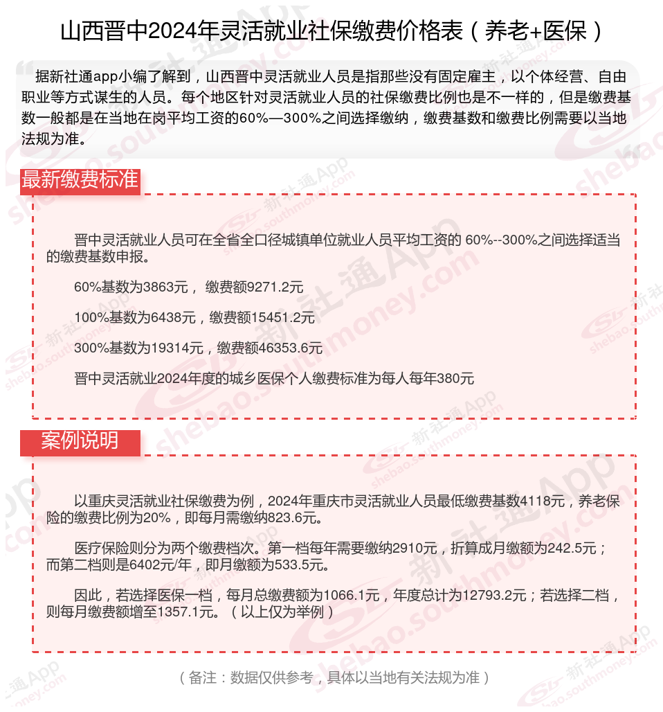 一、2024年山西晋中灵活就业社保缴费基数、比例最新消息