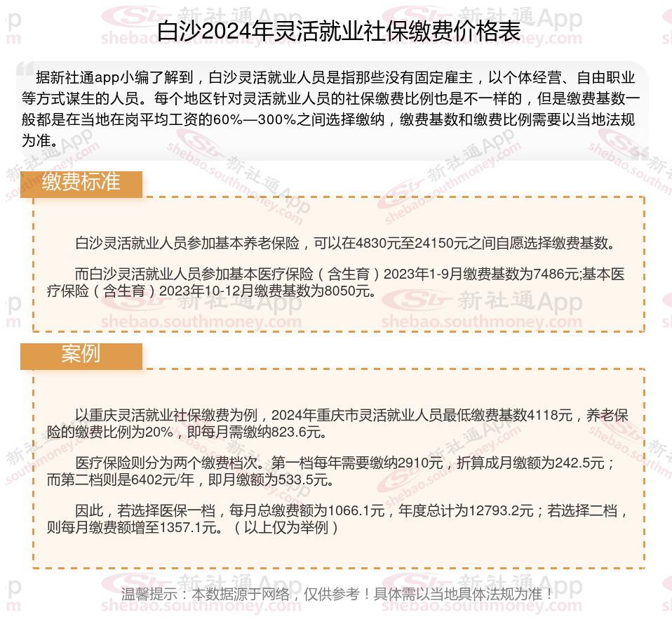 一、2024年白沙灵活就业社保缴费基数、比例最新消息