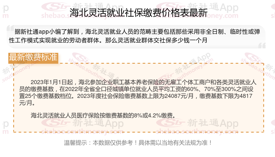什么是灵活就业社保?简单讲灵活就业人员购买的社保就叫灵活就业社保。灵活就业人员是指以非全日制、临时性和弹性工作等灵活形式就业的人员。那么2024年海北灵活就业社保缴费基数是多少?要怎么缴费?15年后能拿到多少钱?接下来随新社通APP小编一起了解海北灵活就业社保缴费具体详情吧。