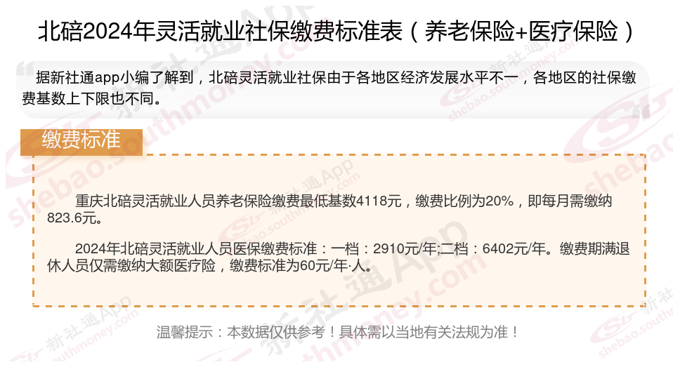 二、2024年北碚灵活就业社保缴费标准表,最新如下: