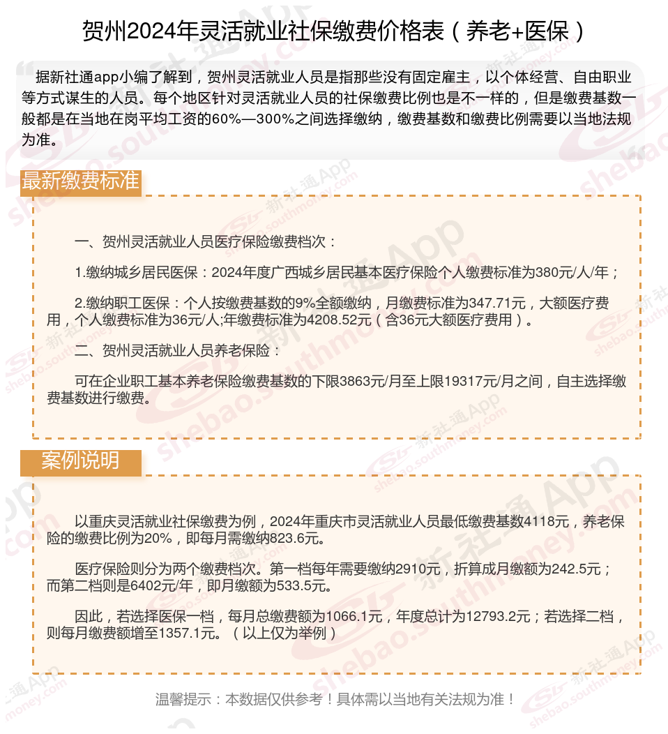 二、贺州2024年灵活就业社保缴费基数及比例最新消息