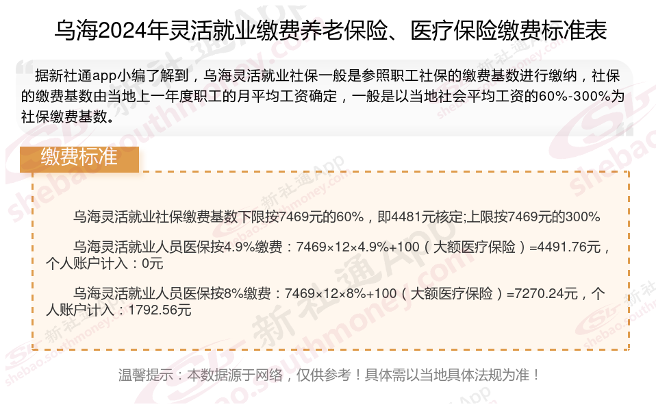 一、2024年乌海灵活就业社保缴费标准表 乌海灵活就业社保多少钱一个月?