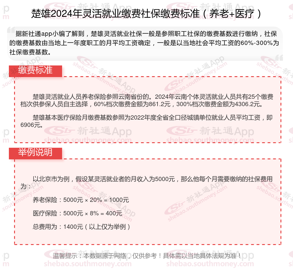 二、楚雄2024年灵活就业社保缴费基数及比例最新消息