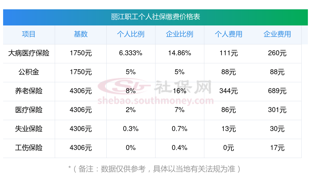 据新社通app小编了解到,2023-2024年丽江社保缴费基数参照为3579.00,丽江社保缴费明细如下: