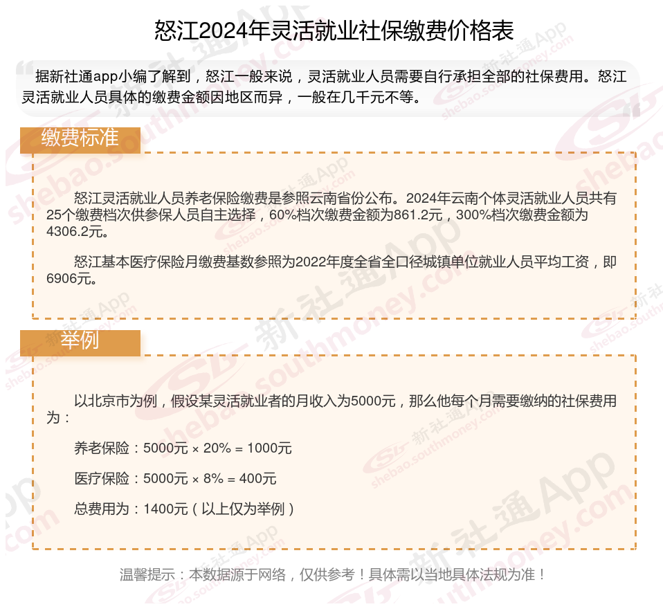 一、2024年怒江灵活就业社保缴费标准表 怒江灵活就业社保多少钱一个月?