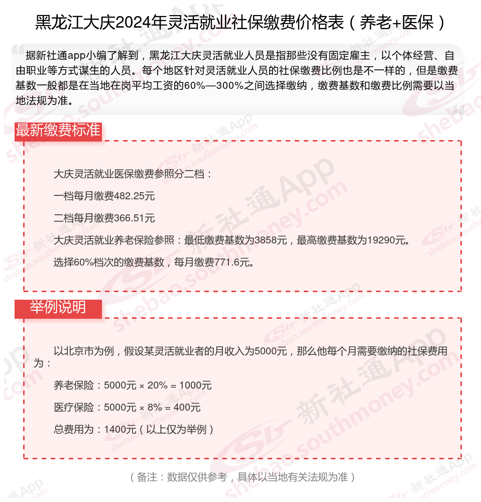 一、2024年黑龙江大庆灵活就业社保缴费标准表 黑龙江大庆灵活就业社保多少钱一个月?