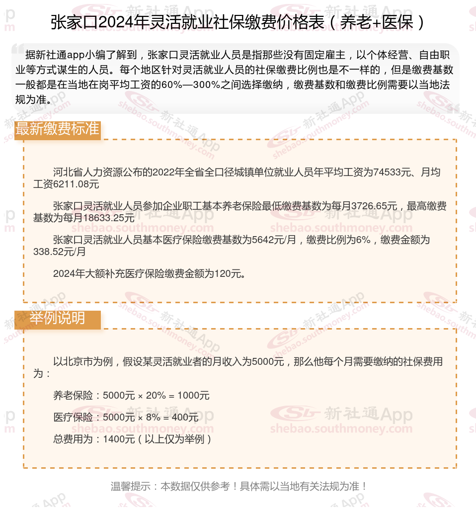 一、2024年张家口灵活就业社保缴费标准表 张家口灵活就业社保多少钱一个月?