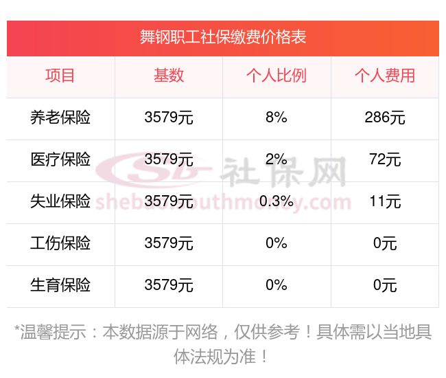 据新社通app小编了解到,2023-2024年舞钢社保缴费基数参照为3579.00,舞钢社保缴费明细如下: