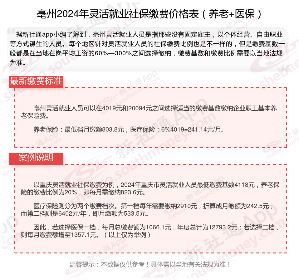 一、2024年亳州灵活就业社保缴费标准表 亳州灵活就业社保多少钱一个月?