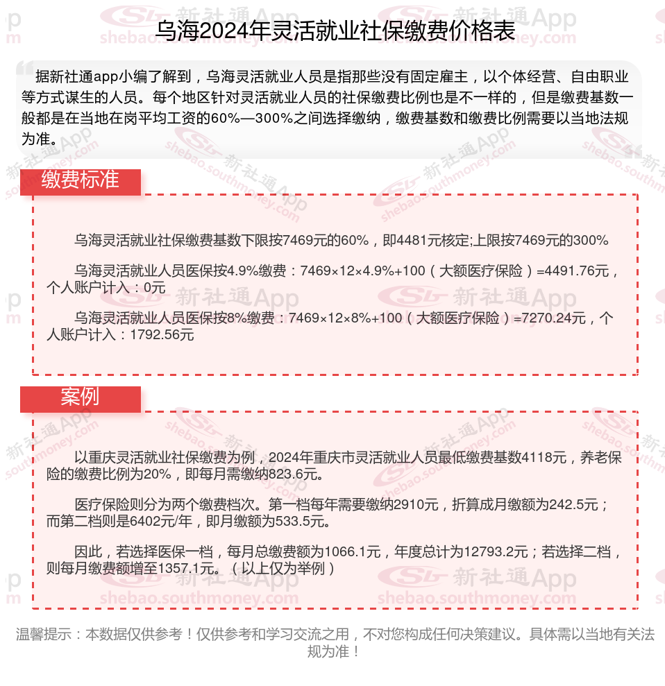 乌海灵活就业社保2024收费标准是多少钱,主要由当地的在岗平均工资和缴费基数来定。其次,灵活就业社保缴纳跟职工缴纳不同的地方在于,灵活就业社保参保只能参保养老保险和医疗保险,且缴纳比例完全由个人承担。另外,灵活就业人员社保参保选择,可自由选择参保城镇职工社保和城乡居民保险。2024年乌海灵活就业社保缴多少钱?如何缴纳?怎么计算待遇?新社通APP小编将在下文为您详细说明。