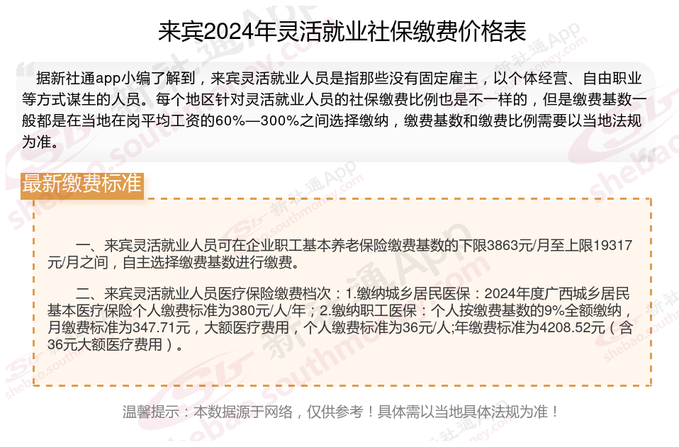 一、2024年来宾灵活就业社保缴费基数、比例最新消息