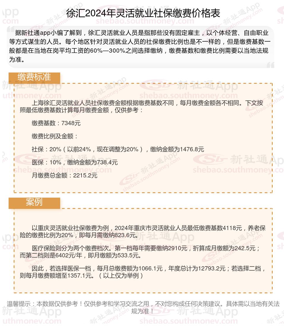 徐汇灵活就业社保2024收费标准是多少钱,主要由当地的在岗平均工资和缴费基数来定。其次,灵活就业社保缴纳跟职工缴纳不同的地方在于,灵活就业社保参保只能参保养老保险和医疗保险,且缴纳比例完全由个人承担。另外,灵活就业人员社保参保选择,可自由选择参保城镇职工社保和城乡居民保险。2024年徐汇灵活就业社保缴多少钱?如何缴纳?怎么计算待遇?新社通APP小编将在下文为您详细说明。